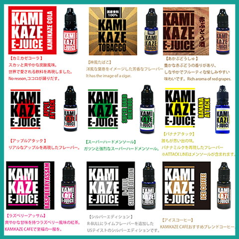 【メール便送料無料】電子タバコ リキッド 国産 タール ニコチン0 KAMIKAZE E-JUICE 15ml カミカゼ 選べる15種 VAPE ベイプ Hilax コーラ メンソール スーパーハードメンソール レッドブル アイスコーヒー 牛乳 オロC ジントニック アップルアタック みかん